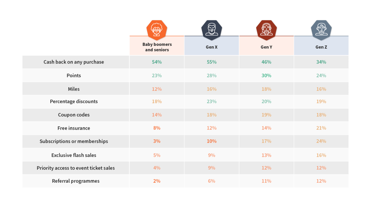 Even within generations, preferences are diverse. While the Gen Z values live entertainment and consumer electronics, a significant portion highly values healthcare and education-related rewards. Similarly, Baby Boomers who prefer grocery rewards may also seek perks in dining or fashion.